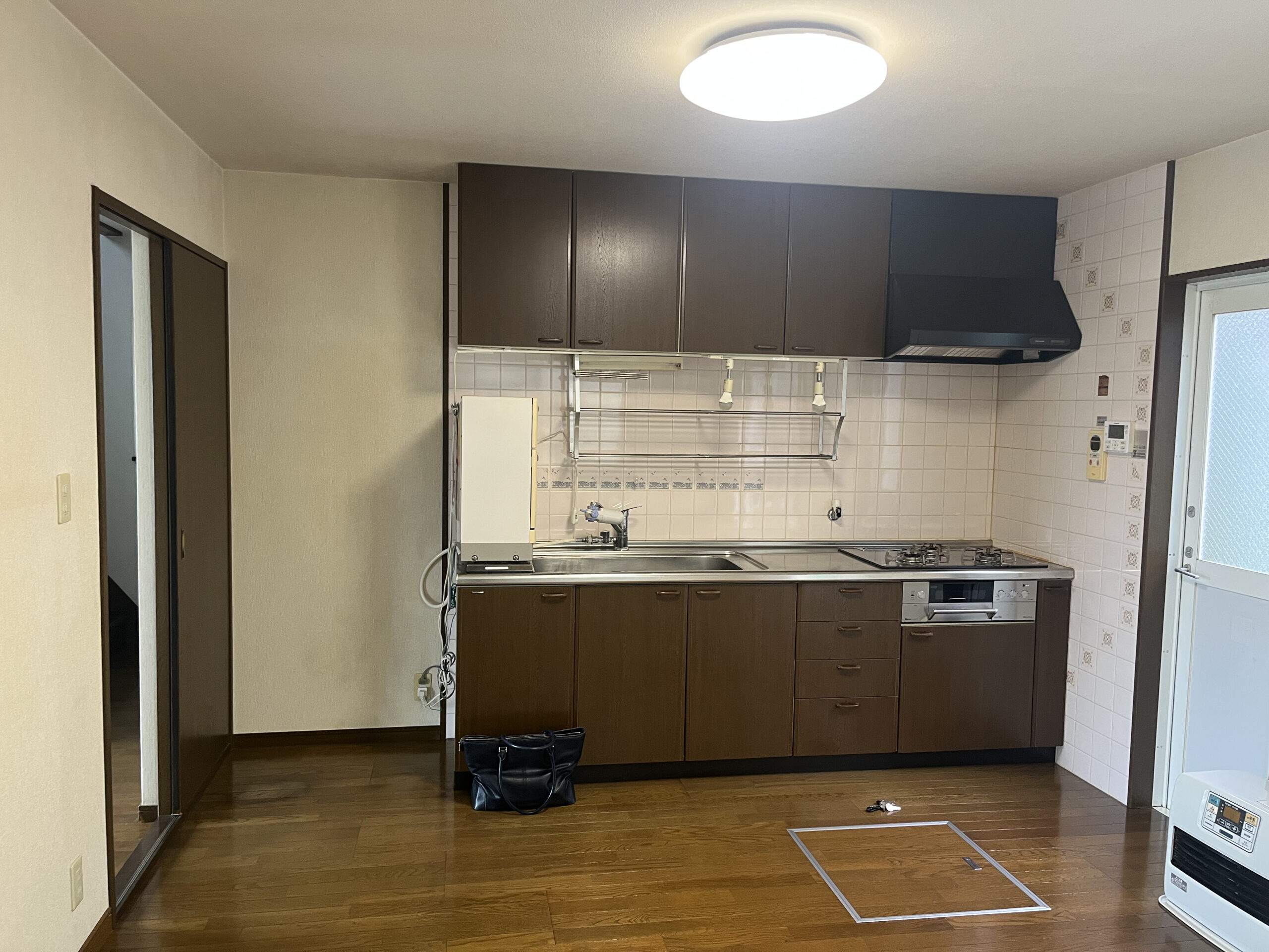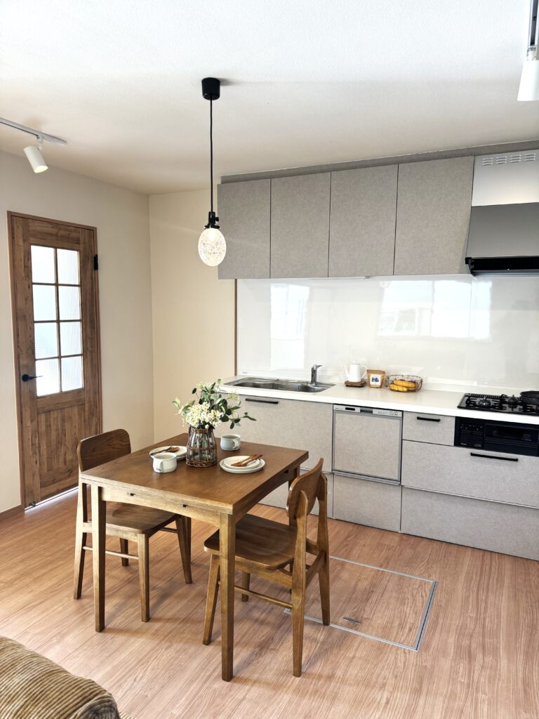 ミルクティカラーのキッチンを中心に、建具や床、家具まで統一感のある色調でまとめられ、それに合わせコーディネートされた家具もそのままお使いいただけます。
