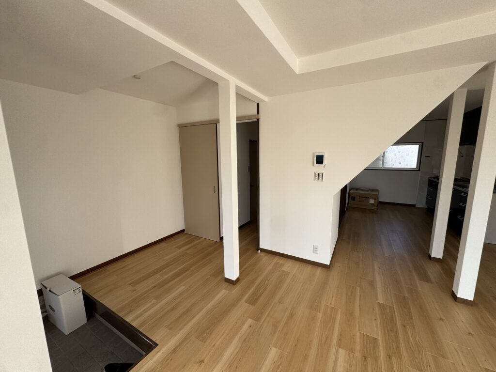 1階部分はLDKをL字型に配置して玄関からの解放感を感じる事ができる建物です。