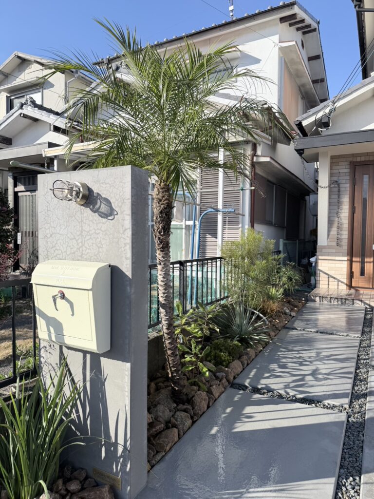オージープランツとブラケットライトが迎えてくれる家